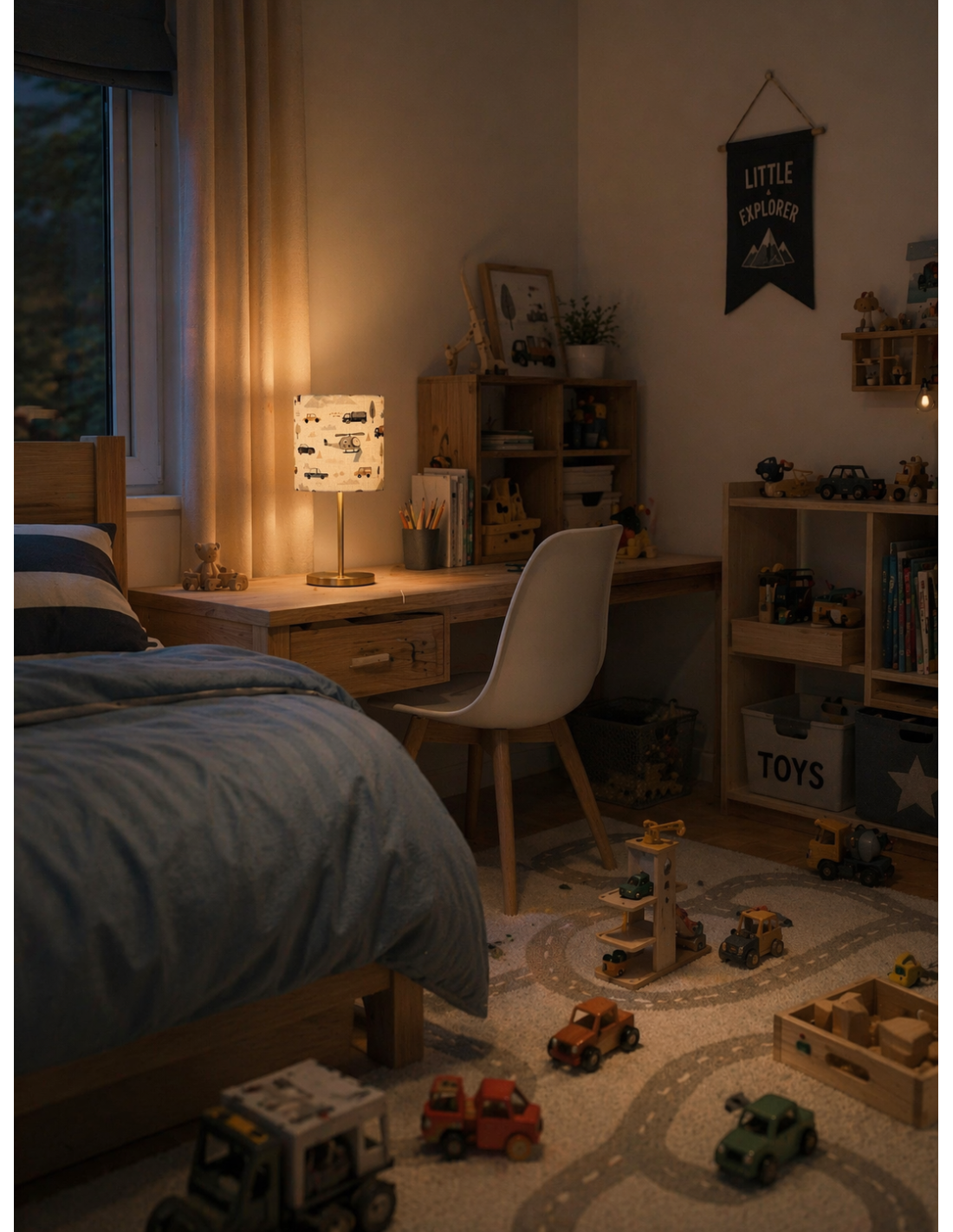 Motor an, Fantasie los: Der Lampenschirm Broom Broom ist gemacht für kleine Autofans und grosse Träumer. Mit liebevollen Illustrationen von Autos, Lastwagen und Helikoptern bringt er spielerische Energie ins Kinderzimmer.